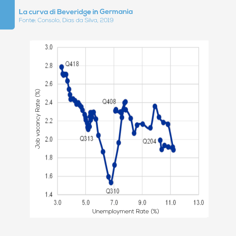 In controtendenza rispetto alla media europea, la Germania sperimenta – tra il 2004 e il 2018 ovvero proprio in concomitanza alle crisi dei mutuo subprime e del debito sovrano – una riduzione delle tensioni sul mercato del lavoro. Sebbene secondo Consolo, Dias da Silva (6) “It is not clear if the Beveridge curve for Germany has shifted inward“, Hutter et al. (9) sostengono, che tale rafforzamento sia dovuto a diversi fattori che per lo più influenzano l’offerta di lavoro:
