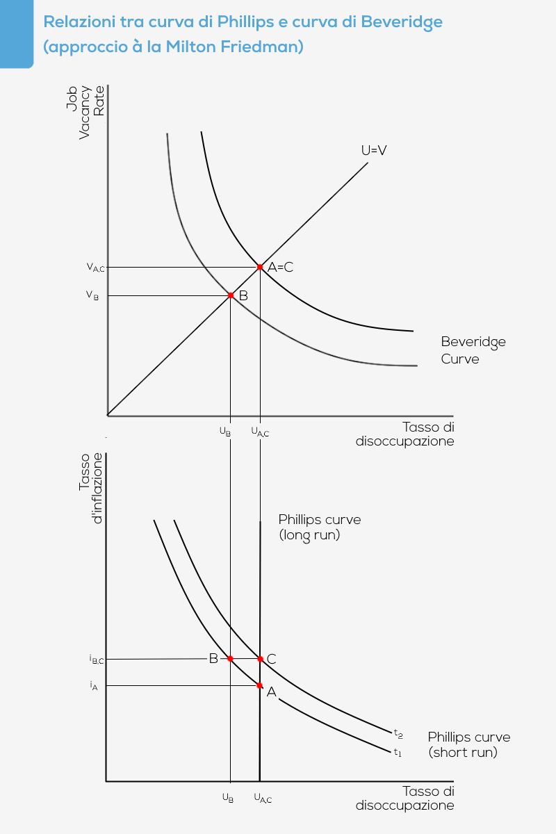 La critica di Milton Friedman alla curva di Phillips (13) ha cambiato radicalmente il quadro interpretativo entro il quale collocare la curva di Beveridge. Come noto, Friedman riteneva che la curva di Phillips potesse essere inclinata negativamente solo nel breve periodo, mentre nel lungo periodo il tasso di disoccupazione doveva considerarsi dato. L’idea che sta alla base dell’interpretazione di Friedman è che i lavoratori si formano delle aspettative sull’inflazione futura e sulla base di tali aspettative decidono di offrire forza lavoro sul mercato. A partire da un equilibrio iniziale definito dal punto A, una politica espansiva determina un incremento della domanda di lavoro delle imprese e una riduzione del tasso di disoccupazione (punto B di entrambe le curve). Tuttavia, questo miglioramento delle condizioni del mercato del lavoro è solo temporaneo, dato che l’aumento salariale innescato dalla crescente domanda di lavoro genera inflazione e riduce i salari reali dei lavoratori, ciò che costituisce un incentivo a una riduzione della forza lavoro offerta: la curva di Phillips di breve termine slitta verso destra e individua un nuovo equilibrio nel punto C; la curva di Phillips di lungo periodo è quindi verticale, la disoccupazione non può essere spinta al di sotto del suo “tasso naturale” e l’unico effetto di politiche espansive è l’incremento del tasso di inflazione.