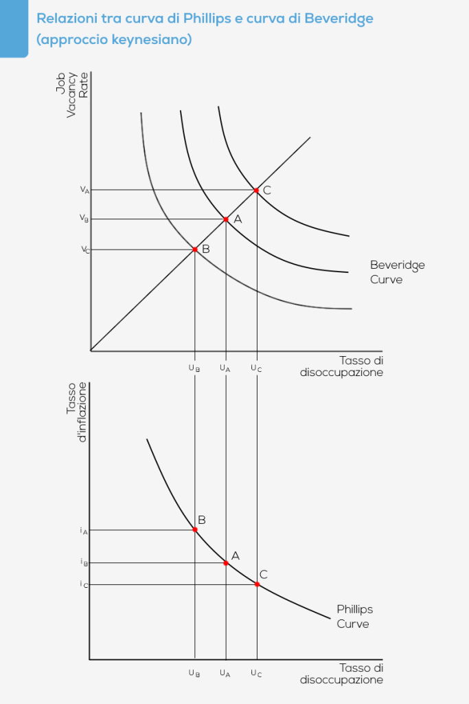 Originariamente la curva di Beveridge è stata usata nel contesto analitico della macroeconomia keynesiana anche grazie alla possibilità di integrarla facilmente con la curva di Phillips (10), in base alla quale variazioni salariali (e quindi del tasso di inflazione) dipendono negativamente da variazioni del tasso di disoccupazione. In termini formali:
