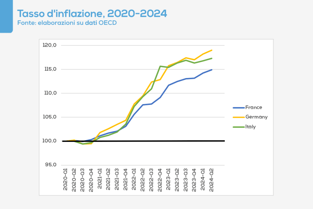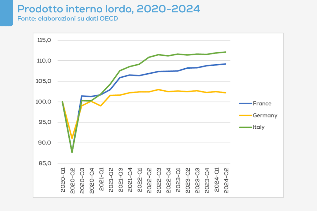 Nella figura che segue sono presentati i dati relativi all’andamento del prodotto interno lordo nei tre paesi considerati e nel periodo che va dal I trimestre 2020 al II trimestre 2024: la rilevazione è stata effettuata con il sistema chain-linking, che garantisce una stima depurata dagli effetti dell’inflazione2. Come si evince da una sommaria analisi, la crescita del prodotto interno lordo italiano (+12,1%) è superiore a quella francese (+9,2%) e, in misura più accentuata, a quella tedesca (+2,2%).