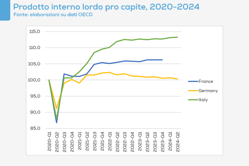 Secondo Carlo Favero17, questo risultato positivo potrebbe essere dovuto al fatto che in Italia l’elevato tasso di inflazione da offerta – le difficoltà di gestione delle catene globali del valore a causa della pandemia, l’incremento dei prezzi dell’energia in seguito al conflitto russo ucraino – ha determinato un incremento del fattore (g + i) della precedente espressione. In realtà la dinamica del prodotto interno lordo è misurata a prezzi costanti – ovvero non considerando l’inflazione – e comunque, anche accettando l’osservazione di Favero, il tasso di inflazione in Italia (+17,3% dal I^ trimestre 2020 al II^ trimestre 2024) non si è discostato significativamente da quello francese (+14,9%) e da quello tedesco (+19,0%).