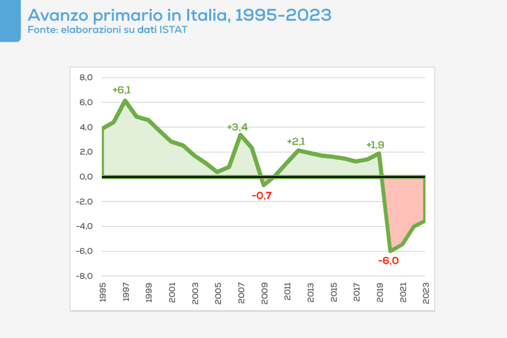 Il principale fattore preso in considerazione per spiegare questa dinamica è l’incremento della spesa pubblica in deficit: infatti, dopo circa 25 anni di quasi costanti avanzi primari (cfr. la figura che segue), dall’inizio della pandemia da COVID-19 l’Italia imbocca la strada del disavanzo primario, complice anche il rilassamento dei vincoli fiscali operato dall’Unione Europea.