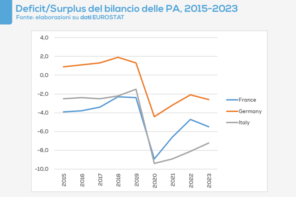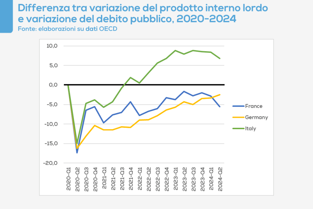 Questa evidenza appare confermata anche dal confronto tra tasso di crescita del prodotto interno lordo e tasso di crescita del debito pubblico: in Italia la differenza tra queste due grandezze è positiva, mente in Francia e Germania è negativa.