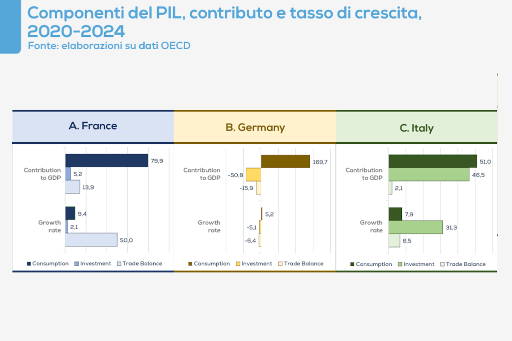 Se si considerano le principali componenti del prodotto interno lordo dal lato della spesa e degli impieghi, è da rilevare che in Francia e in Germania il principale contributo alla crescita – nel periodo compreso tra il I trimestre 2020 e il II trimestre 2024 – è da attribuire ai consumi finali, mentre investimenti e commercio estero contribuiscono in misura negativa (in Germania) o pressoché nulla (in Francia) a tale crescita. In questi paesi, la componente più dinamica è proprio la spesa per consumi: in Germania cresce del 5,2% e in Francia del 9,4%, mentre la crescita dei consumi finali in Italia si pone in una posizione intermedia (+7,9%).