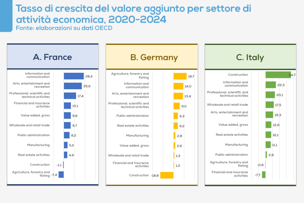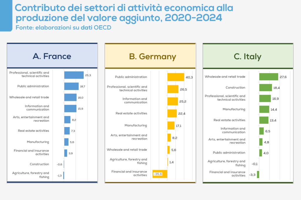 In Francia e in Germania assumono una rilevanza particolare i settori che gestiscono la transizione organizzativa e climatica in atto: si tratta della pubblica amministrazione, delle attività professionali, scientifiche e tecniche e delle telecomunicazioni. Questa rilevanza è dovuta al forte incremento del valore aggiunto almeno nei settore delle delle attività professionali, scientifiche e tecniche e in quello delle telecomunicazioni.