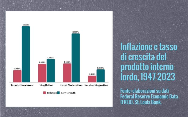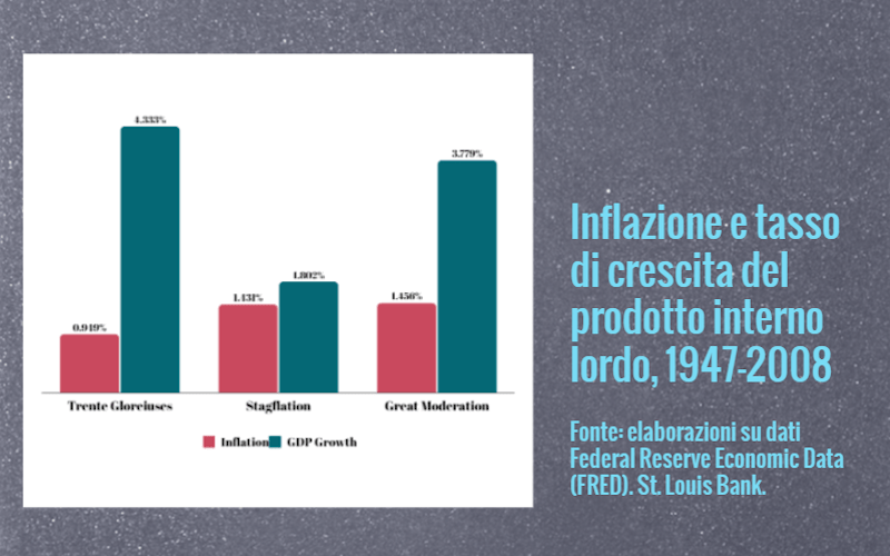 In definitiva, in questo periodo viene meno il caposaldo su cui si regge tutta la narrazione monetarista della Grande Moderazione, ovvero il fatto che la mancanza di inflazione favorisca in qualche modo la crescita economica. In effetti, in tutto il dopoguerra mai il tasso di inflazione è stato così contenuto, così come mai è stata registrata una crescita media del prodotto interno lordo tanto bassa. Così, se l’inflazione poteva essere correlata al rallentamento della crescita economica, la crisi del 2008 dimostra che anche una diminuzione del tasso di inflazione può essere correlato a una contrazione del tasso di crescita. Quasi che la crisi dei mutui subprime volesse suggerirci che non esiste una correlazione univoca tra le due variabili, ma che occorre considerare le differenti cause dell’inflazione e i differenti impatti che tali cause hanno sulla crescita economica: insomma, sembra essere un po’ più complicato di così.