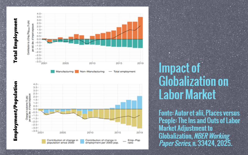 “i decenni del dopoguerra di rapida crescita economica e di distribuzione relativamente equa del reddito in Occidente si basavano sui controlli sui capitali, che erano una caratteristica del sistema monetario di Bretton Woods che rendeva difficile spostare rapidamente i capitali attraverso i confini internazionali. Ciò significava che i proprietari di capitale erano bloccati con qualsiasi compromesso politico democratico fosse stato fatto a livello nazionale, l’esempio classico sono le tasse molto elevate degli anni ’50 e ’60. Questo ha funzionato perché si potevano tassare i proprietari di capitale, ed era molto difficile per loro andarsene con il loro capitale. Ciò significava che avevano un incentivo a reinvestire i profitti ed espandere la produzione in patria per mantenere bassa la disoccupazione. Con una bassa disoccupazione, il lavoro è relativamente potente, e questo crea una specie di comunità condivisa di obblighi soggetta alla stessa responsabilità democratica. Semplicemente non è più fattibile. Senza quei controlli sui capitali, è possibile che il capitale si allontani da una comunità di obblighi”. ↩︎ - Cfr. D. Autor, D. Dorn, G. H. Hanson, M. R. Jones, B. Setzler, Places versus People: The Ins and Outs of Labor Market Adjustment to Globalization, NBER Working Paper Series, n. 33424, 2025. ↩︎